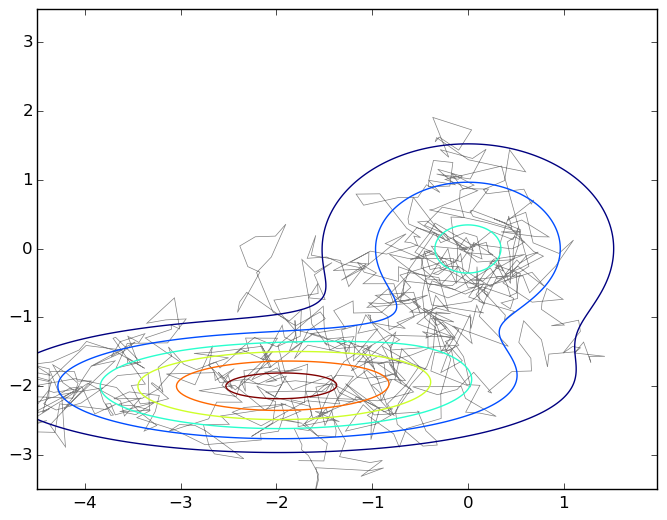 И снова картинка — вот типичное блуждание на плоскости под графиком смеси двух двумерных гауссианов: