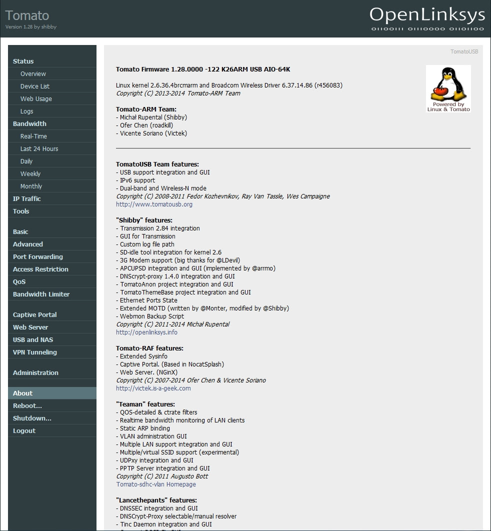 Я уже довольно продолжительное время пользуюсь маршрутизаторами на платформах Broadcom. Исторически сложилось так, что все они перепрошивались на tomato от Shibby. С появлением маршрутизаторов на ARM процессорах, он добавил новые версии прошивок. На текущий момент имеются прошивки для маршрутизаторов ASUS RT-N18U, ASUS RT-AC56U, ASUS RT-AC68U/R и Netgear R7000. Поддержка ASUS RT-N18U заявлена с версии 121 и старше.
