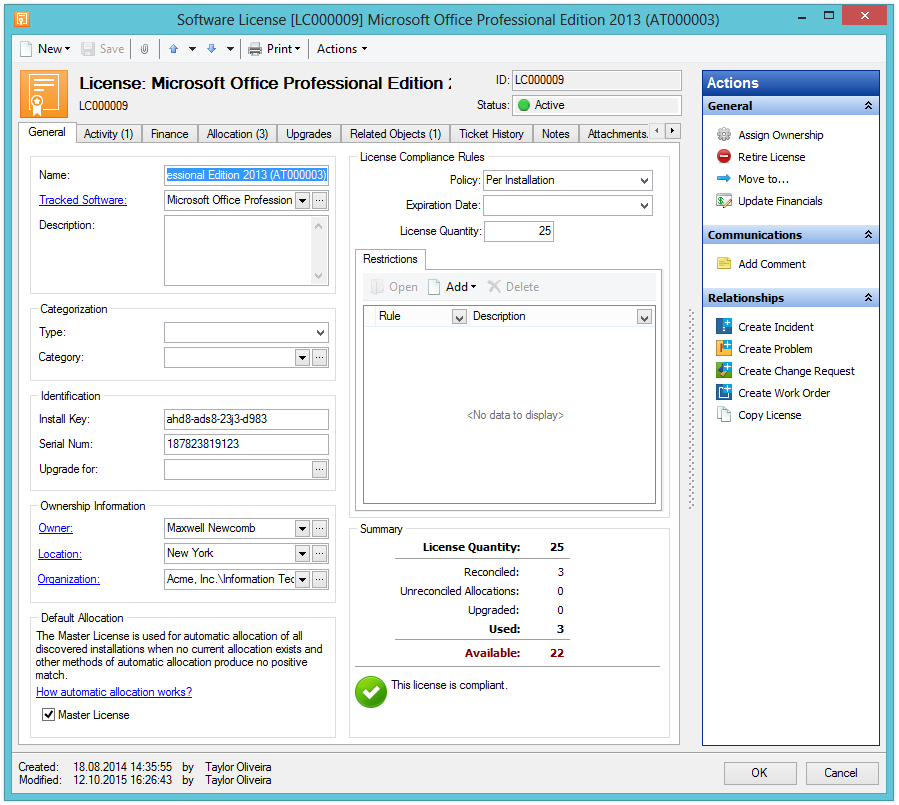 В карточке лицензии учитываются общие параметры, прописываются ключи и идентификаторы, содержатся сведениях об апгрейдах и связанных тикетах.